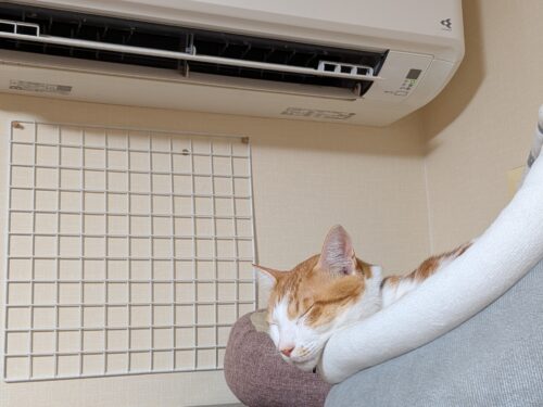 After写真では、新しくなったエアコンの下で猫が心地良さそうに寝ている様子が確認できます。