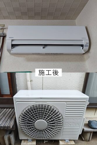 設置完了後の様子がこちらです。最新のHITACHI製エアコンはクリーン機能や省エネ性能が格段に向上しています。