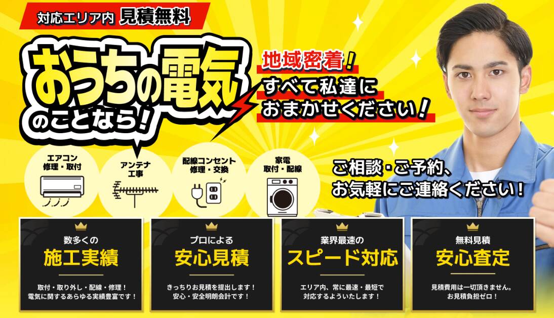 エアコンクリーニング・洗浄、コンセント修理・交換、スイッチ修理、交換、ブレーカー修理・交換、単相3線式切替工事、エアコン修理・取付、照明器具の修理・交換、換気扇・レンジフード修理・交換、インターホンの修理、交換、テレビアンテナの修理・取付、漏電調査、漏電修理、LAN配線、電気配線工事、防犯カメラ、家庭用EV充電工事、業務用エアコン交換・取付・修理、4K・8K受信工事
